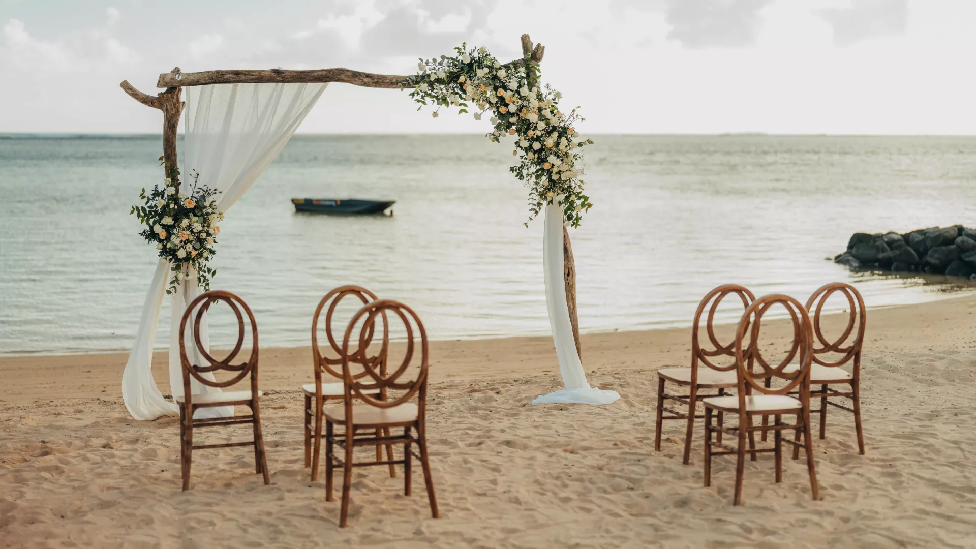 Stellen Sie sich vor, Sie stecken mit den Füßen im Sand und spüren die Sonne auf Ihrer Haut unter einem wunderschönen Blumenbogen vor der Kulisse einer herrlichen blauen Lagune. Beobachten Sie, wie sich die Sonne auf dem Meer spiegelt, und legen Sie Ihre Gelübde ab, während die Wellen eine wunderbare Melodie für Sie spielen.